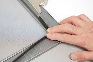 2辺目も先に角を押し込んでから、1辺目と同じ要領でローラーを転がし、網押さえゴムを押し込んでいきます。
